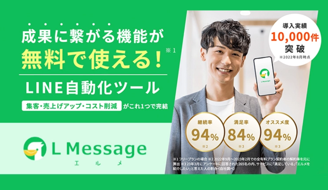 L Message(エルメ)は集客・売上アップ・コスト削減が1つでできるLINE自動化ツール。LINE公式アカウントの機能を補完し、売上アップや業務効率化、自動化につながる独自機能も搭載。どなたでもすぐにLINEマーケティングを始めることができます。
