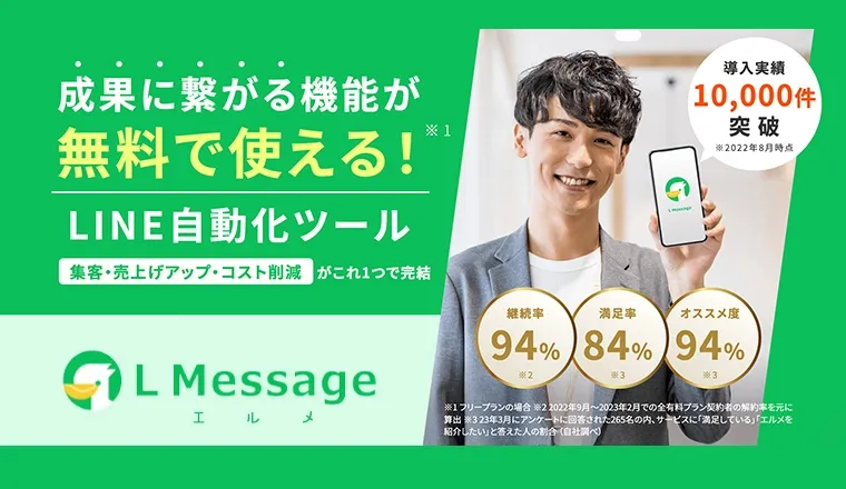 L Message(エルメ)は集客・売上アップ・コスト削減が1つでできるLINE自動化ツール。LINE公式アカウントの機能を補完し、売上アップや業務効率化、自動化につながる独自機能も搭載。どなたでもすぐにLINEマーケティングを始めることができます。