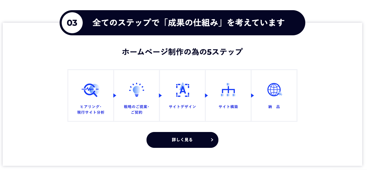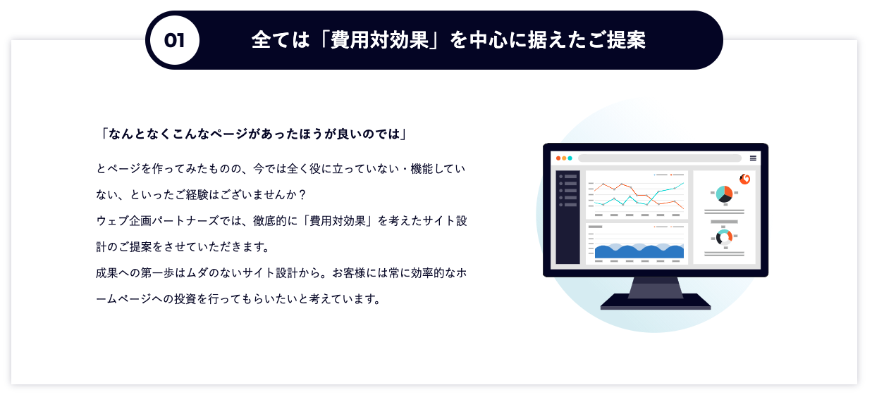 ホームページ制作には必ず目的となる背景が存在しています。ステークホルダーから状況・ニーズをヒアリングし、そこから導き出される課題を解決できる提案で、お客様を成功へ導くことも私たちの役割です。