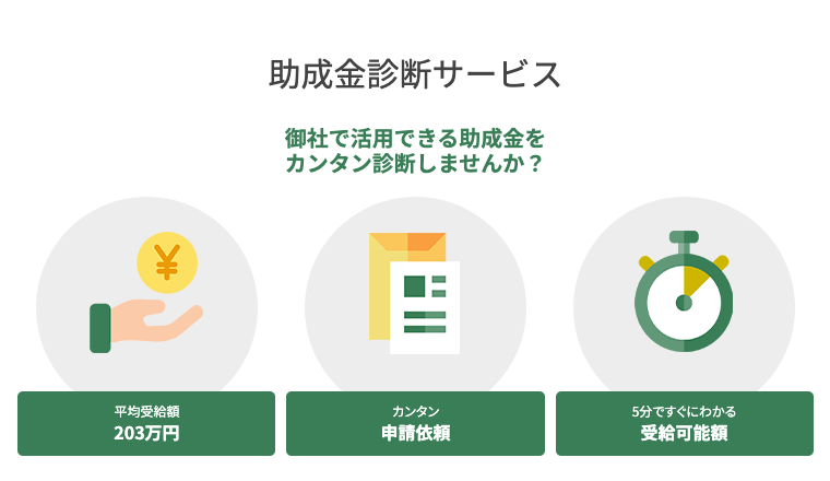 助成金は3000種類以上あると言われています。その中から自社に最適な助成金を見つけ出し、不備なく申請し、受給するのは難しいというお声をよく耳にします。 本助成金診断サービスでは、御社に最適な助成金と受給可能金額をご確認いただけます。